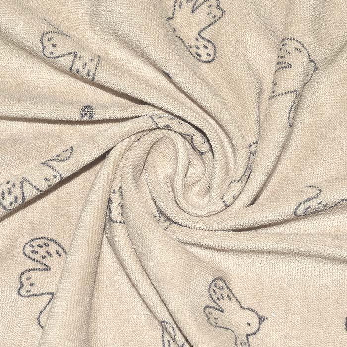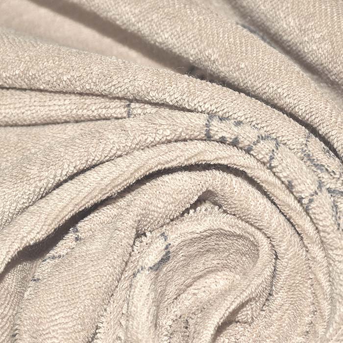 Elastischer Frottee ist ein weiches Baumwoll-Strickgewebe mit sichtbaren Schlingen auf der Vorderseite. Es ist sehr saugfähig und wird daher am häufigsten für Bademäntel, Morgenmäntel, Spannbettlaken, Kleidung für Kinder usw. verwendet.