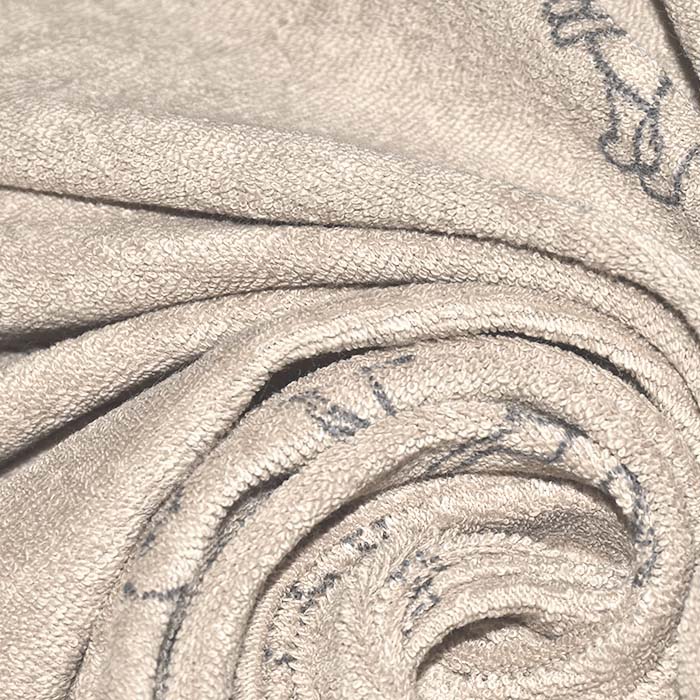 Vor der Verarbeitung ist Waschen erforderlich, da das Strickgewebe beim ersten Waschen einläuft. Eine übermäßige Dosierung von Weichspüler verringert die Saugfähigkeit des Materials. Die Schlingen auf dem Frottee werden durch Bügeln plattgedrückt, daher raten wir davon ab.