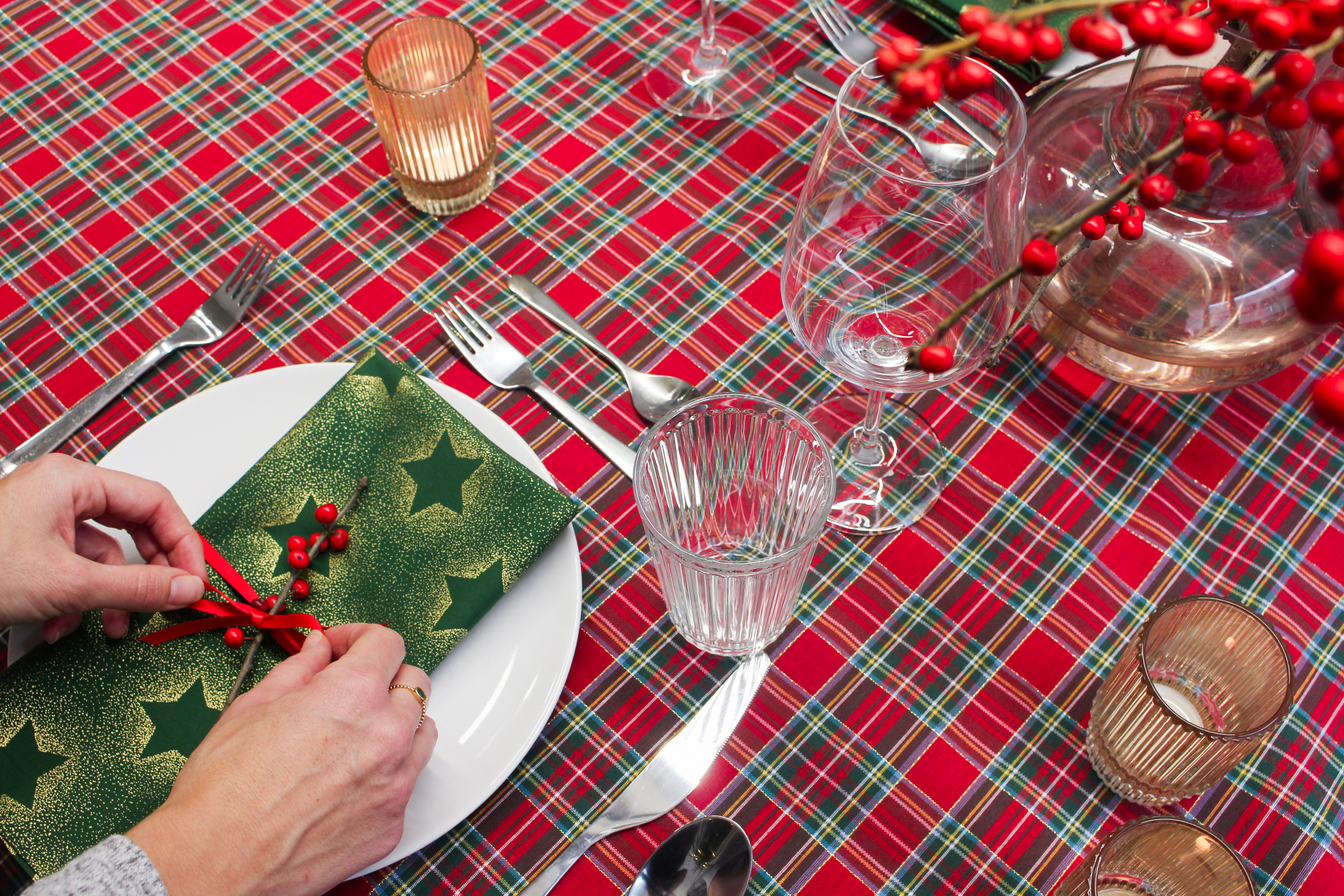 Bei der Dekoration ist die Tischdecke immer die Basis, von der aus wir alle anderen ergänzenden Farben, das Geschirr und die Accessoires auswählen können. Wir empfehlen dir, zuerst alle Teller, das Besteck und die Gläser auf den Tisch zu stellen und dann abzuschätzen, wie viel Platz für die Dekoration bleibt. Das Wichtigste ist, dass sich deine Gäste wohlfühlen.