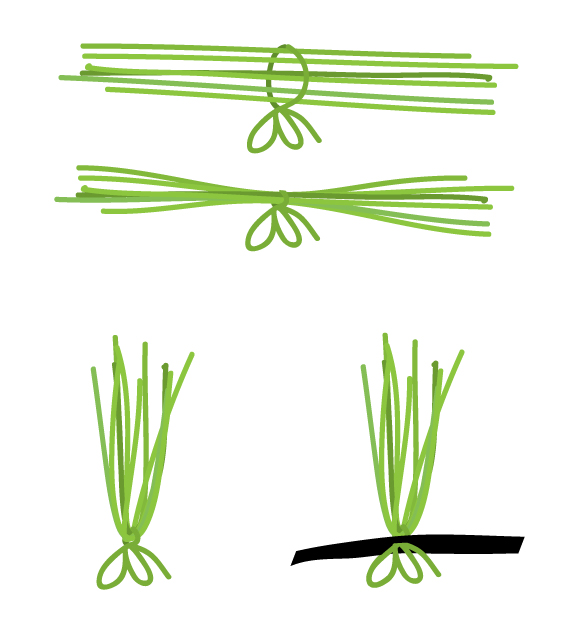 Für die langhaarige Perücke ist die Technik etwas anders, vielleicht schneller, denn die Büschel werden nur durch die Mitte der Mütze eingetragen (wo normalerweise der Scheitel ist). Vorne werden für die Stirnfransen noch die kürzere Büschel hinzugefügt.