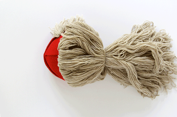 Erst einmal wird das Garn in gleich lange Bänder geschnitten, und zwar doppelt so lang wie die Endlänge betragen soll. Das Garn-Bündel wird in der Mitte mit einem starken Knoten zusammengebunden. An der Stelle, wo sich der Knoten befindet, werden die `Haare` auf die Mütze befestigt. Auf der Rückseite wird die Häkelnadel durch das Loch eingesteckt, auf dem das Haarbüschel fixirt wird; Eine Seite des Knotens wird danach durch dieses Loch gezogen. Durch das Nachbarloch wird noch die andere Seite des Knotens gezogen und auf der Rückseite nochmal gebunden, damit das Büschel nicht wegfällt.