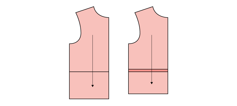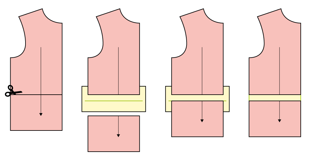 Es ist wichtig, dass man gleiche Änderungen an Vorder- und Rückenteil des Schnittmusters vornimmt. Z.B. auf einem T-Shirt ist im Prinzip die beste Stelle für Änderungen zwischen der Naht unter der Achsel und dem Ärmelsaum. Bei einer Hose ist das zwischen dem Hosenschritt und dem Knie, sowie halbwegs zwischen dem Knie und der Hosenbeinkante. Man soll aber jedoch den Stil des Kleidungsstücks beachten und nach Bedarf die Korrekturstelle anpassen, denn es muss die Länge des Schnittmusters geändert werden, nicht die Form.