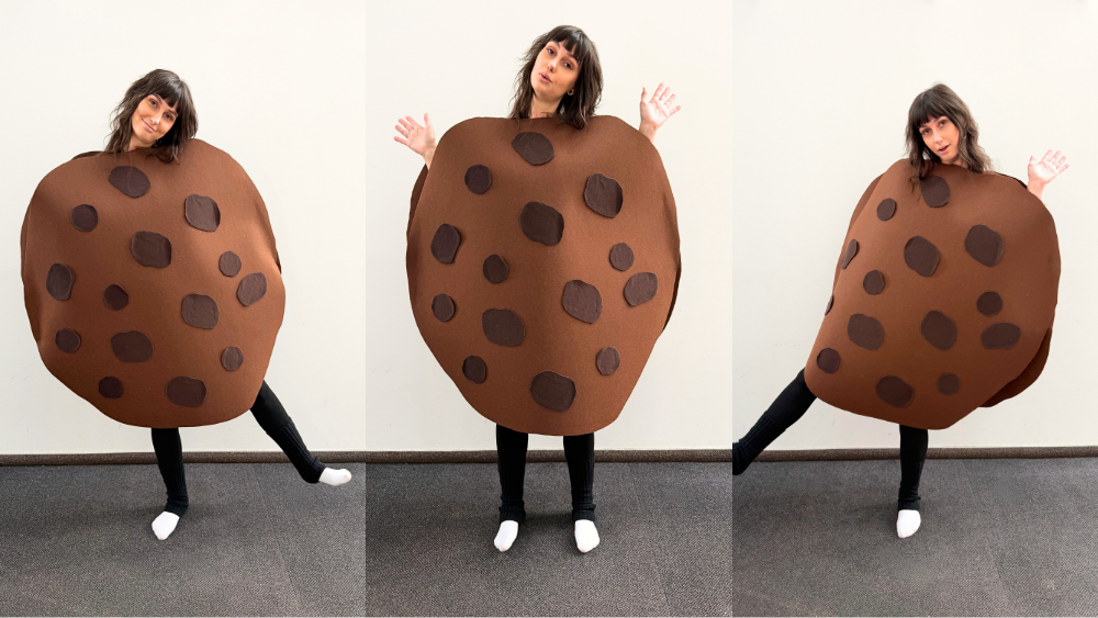 Einfaches DIY-Faschingskostüm Keks aus Filz, das du schnell zu Hause herstellen und auch an andere Motive anpassen kannst.