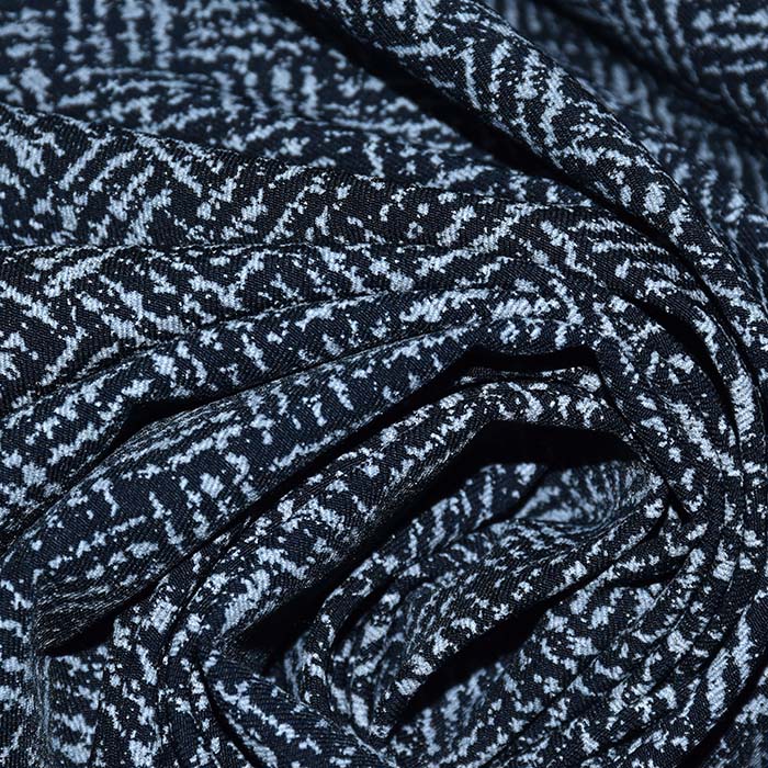 Bengalin-Gewebe mit Muster, das sich über die gesamte Länge erstreckt. Es eignet sich für die Herstellung von Jacken, Mänteln, als Accessoire oder für dekorative Zwecke. Es wird auch für Kleidungsstücke verwendet, bei denen das Volumen betont werden soll, z. B. bei Ballonröcken, da der Stoff fest und formstabil ist.