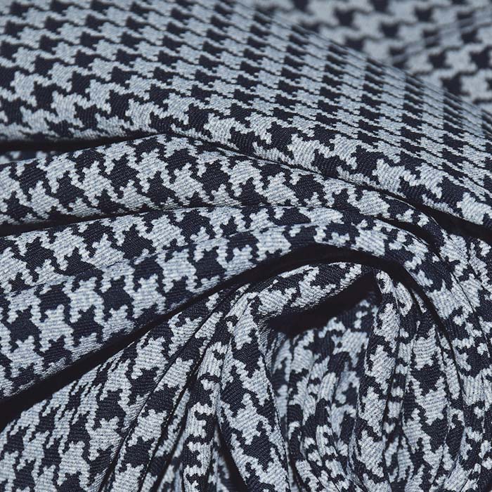 Bengalin-Gewebe mit Muster, das sich über die gesamte Länge erstreckt. Es eignet sich für die Herstellung von Jacken, Mänteln, als Accessoire oder für dekorative Zwecke. Es wird auch für Kleidungsstücke verwendet, bei denen das Volumen betont werden soll, z. B. bei Ballonröcken, da der Stoff fest und formstabil ist.