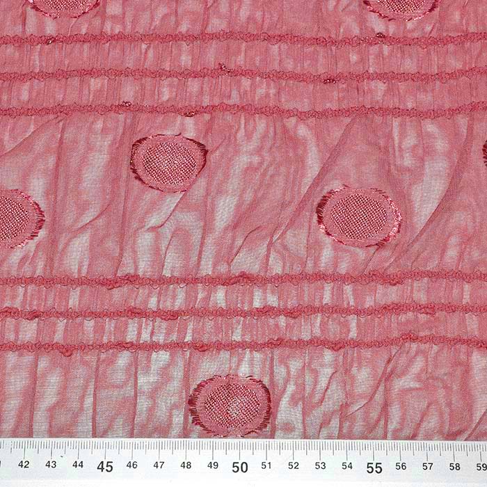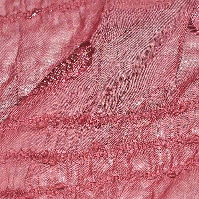Polyesterchiffon ist ein feines, elastisches, dünnes und leicht durchscheinendes Gewebe. Die ungleichmäßige Faltung verleiht ihm das Aussehen einer Falte. Er wird häufig in Kombination mit Satin für leichte Sommer- und Gesellschaftskleider, Tuniken, Blusen, Röcke, Schals, Tücher usw. verwendet.