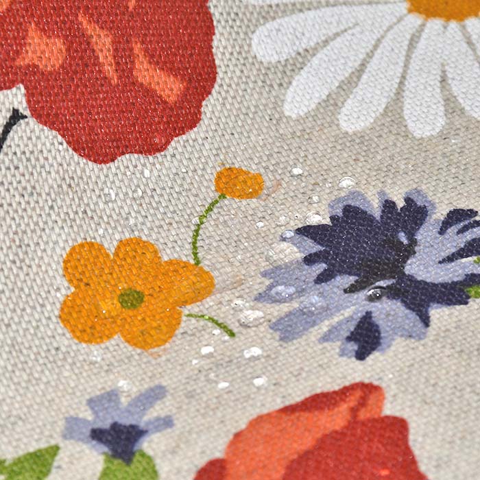 Gewebe mit imprägniertem Auftrag ist eine Mischung aus Baumwolle und Polyester, die eine einfachere Pflege und eine breitere Palette von Anwendungen im dekorativen Bereich ermöglicht. Er wird am häufigsten für die Herstellung von Taschen, Tischdecken, Schürzen, Zierkissen usw. verwendet.