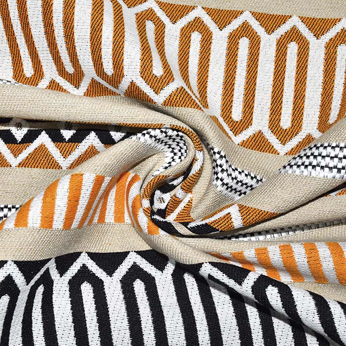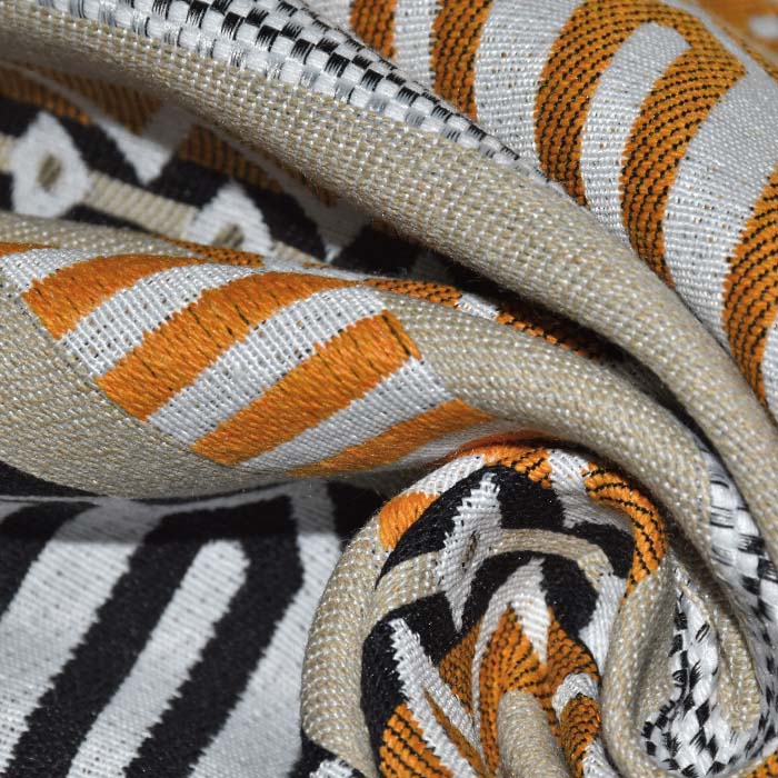 Dickes und dauerhaftes Gewebe mit Jacquardmuster, das auf beiden Seiten verwendet werden kann oder die Seiten werden miteinander kombiniert. Es eignet sich für Möbelpolsterung, schwere dekorative und Verdunkelungsvorhänge, sowie für Handtaschen und andere Accessoires. Kann auch für modische Mäntel und Cardigans verwendet werden. Für bessere mechanische Eigenschaften besteht das Gewebe aus Baumwolle/Polyester-Mischung, gleichzeitig behält es aber auch die natürliche Optik und Gefühl bei.