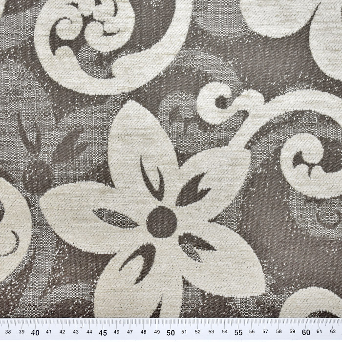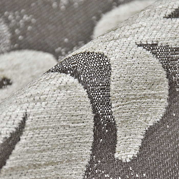 Dickes und dauerhaftes Gewebe mit samtartigem Jacquardmuster, das auf beiden Seiten verwendet werden kann oder die Seiten werden miteinander kombiniert. Es eignet sich für Möbelpolsterung, schwere dekorative und Verdunkelungsvorhänge, sowie für Handtaschen und andere Accessoires. Kann auch für modische Mäntel und Cardigans verwendet werden. Für bessere mechanische Eigenschaften besteht das Gewebe aus Baumwolle/Polyester-Mischung, gleichzeitig behält es aber auch die natürliche Optik und Gefühl bei.