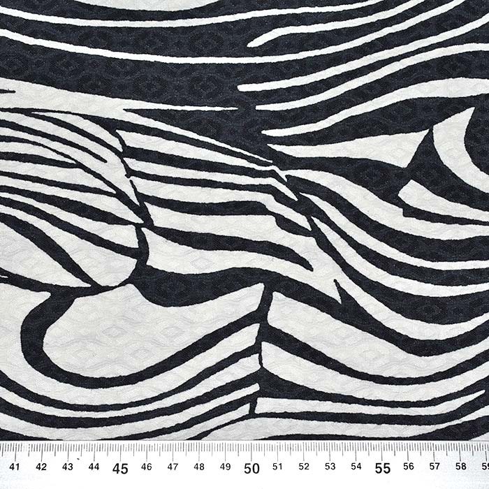 Bengalin-Gewebe mit Jacquard-Muster, das sich über die gesamte Länge ausdehnt. Es eignet sich für die Herstellung von Jacken, Mänteln, als Accessoire oder für dekorative Zwecke. Es wird auch für Kleidungsstücke verwendet, bei denen das Volumen betont werden soll, z. B. bei Ballonröcken, da der Stoff fest und formstabil ist.
