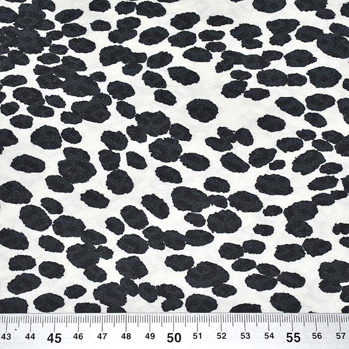Bengalin-Gewebe mit Jacquard-Muster, das sich über die gesamte Länge ausdehnt. Es eignet sich für die Herstellung von Jacken, Mänteln, als Accessoire oder für dekorative Zwecke. Es wird auch für Kleidungsstücke verwendet, bei denen das Volumen betont werden soll, z. B. bei Ballonröcken, da der Stoff fest und formstabil ist.