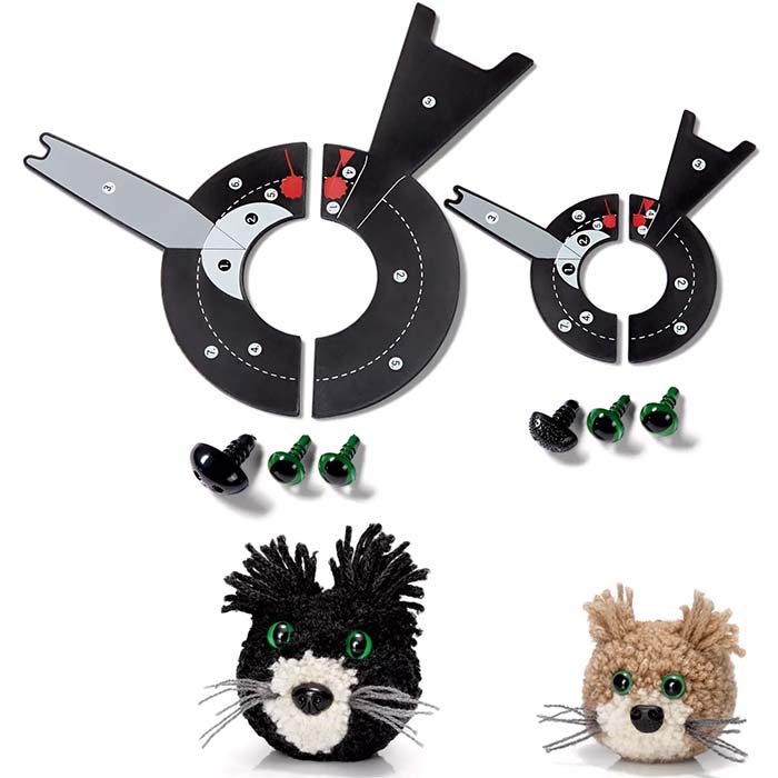 Schablonen für Bommeln ermöglichen die Herstellung süßer Tiermotive. Das Basteln der Bommeln ist sehr einfach und auch für Kinder geeignet. Im Set sind zwei Schablonen enthalten (groß 9 cm und klein 5,5 cm), eine Schritt-für-Schritt-Anleitung sowie Augen und/oder Schnäuzchen für beide Tiere.