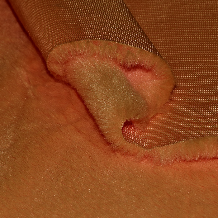 Pelz wird nicht mit der Schere geschnitten, da dabei auch die Haare abgeschert werden. Zum Schneiden soll ein kleines Messer oder eine Rasierklinge verwendet werden (mit der Rasierklinge soll nur die Rückseite durchgeschnitten werden).