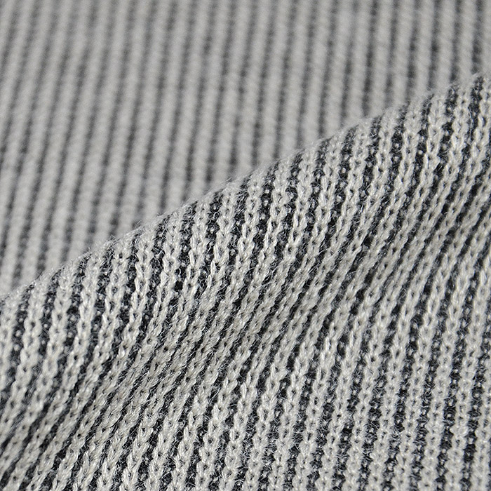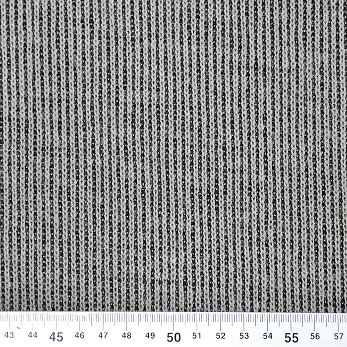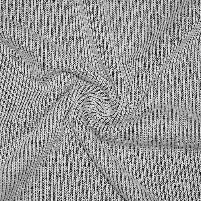 Weiche und angenehme gerippte Wirkware aus verschiedenfarbigem Garn mit einem Melange-Farbeffekt. Sie ist sehr weich und angenehm und die Art des Strickens verleiht die notwendige Elastizität für Artikel wie Tuniken, T-Shirts, Pullover, einfache Cardigans, Kleider und andere, anliegende Kleidung. Wegen der Weichheit ist sie auch für Schalls und Halstücher geeignet.