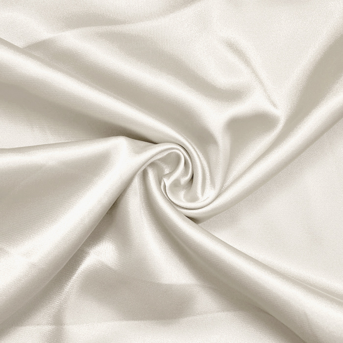 Polyester-Satin mit Elastan ist ein dünnes einfarbiges Gewebe mit starkem Glanz auf der rechten Stoffseite. Er ist weich und hat einen schönen Fall, deswegen wird er am häufigsten für festliche Kleidung, Kleider, Röcke, Tuniken, Blusen, Schals usw. verwendet.