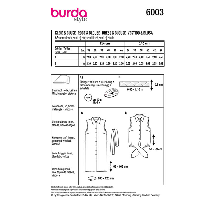 Schnittmuster, gelb, Damenbluse und -kleid, 6003