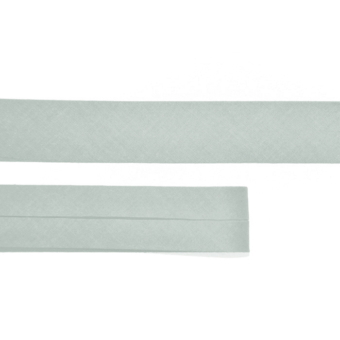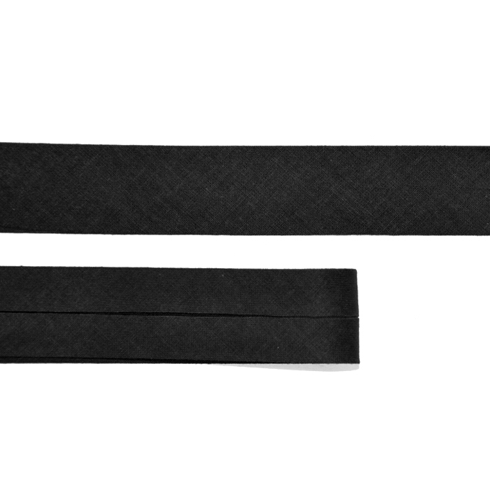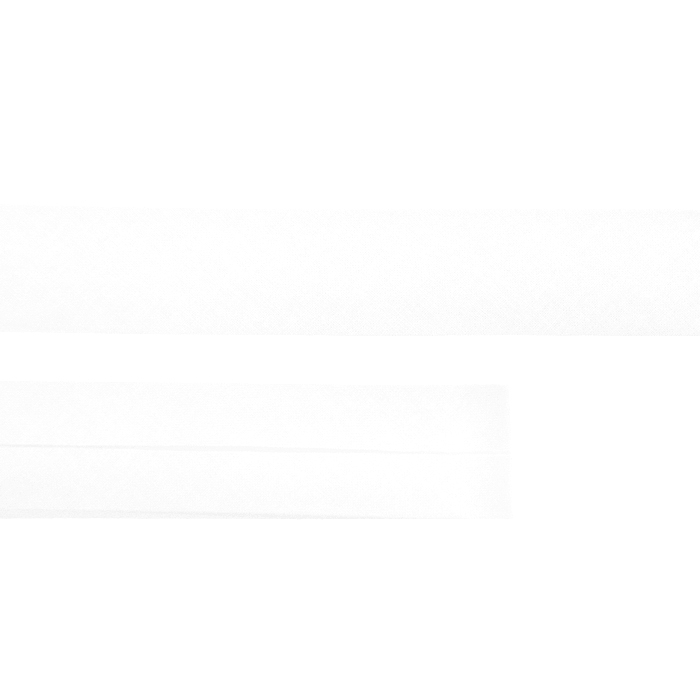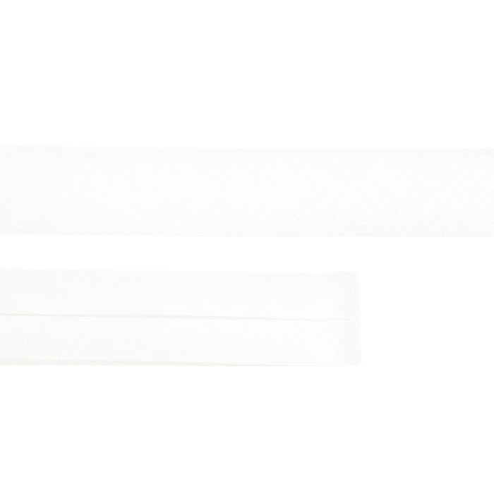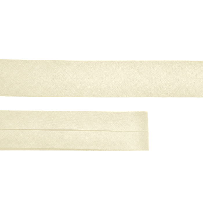 Baumwollschrägband mit einer Breite von 50 mm in geöffnetem Zustand bzw. 25 mm Endbreite am Rand des Produkts. Die Falten reichen bis zur Mitte. Es wird vor allem zum Einfassen von Produkten aus Baumwolle und anderen Naturfasern verwendet.
