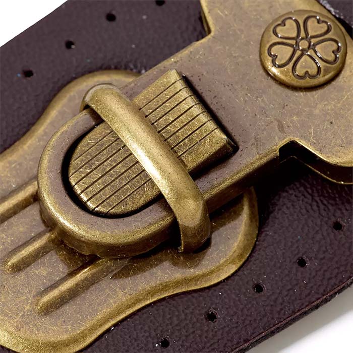 Das Steckschloss passt hervorragend sowohl zu Vintage- als auch zu modernen, lässigen Stilen. Es besteht aus zwei Teilen, die auf dunkelbraunes Kunstleder in dunkelbrauner Farbe befestigt sind, mit vorgestanzten Löchern zum einfachen Annähen. Der Verschluss ist aus rostfreiem, gebürstetem Metallmaterial gefertigt, mit feinen Längsrillen und einem dekorativen runden Detail auf der Vorderseite.