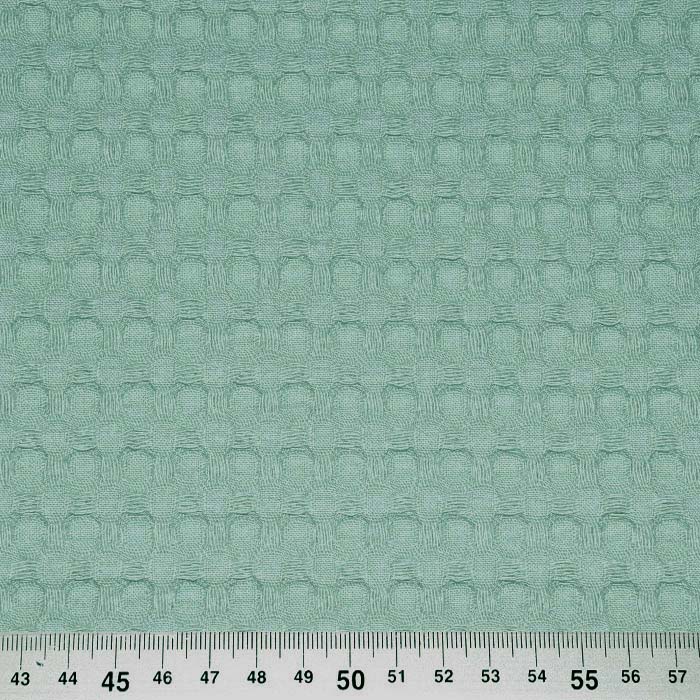 Weicher Baumwoll-Pikee in Waffelbindung. Waffel- oder Wabenbindung ist eine Ableitung vom Kreuzstichköper, wo die Basis und Schuss schlaff bindende Erhöhungen bilden, was dem Stoff das zellenartiges Erscheinen gibt, das auf die Bienenwabe erinnert.