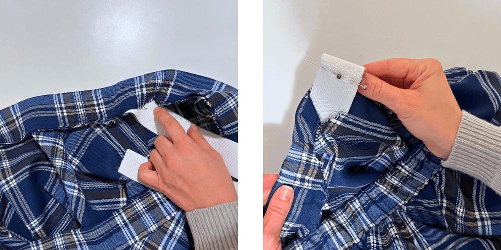 Miss die Länge des Gummibands an deiner Taille, sodass es gut sitzt, füge 2 cm für die Naht hinzu und schneide es ab. Führe das Gummiband durch die Öffnung in der Taille, nähe die Enden des Gummibands fest und nähe dann die Öffnung zu. Versäubere die innere Schnittkante an der Taille mit einem Zickzack- oder Overlock-Stich und fertig!