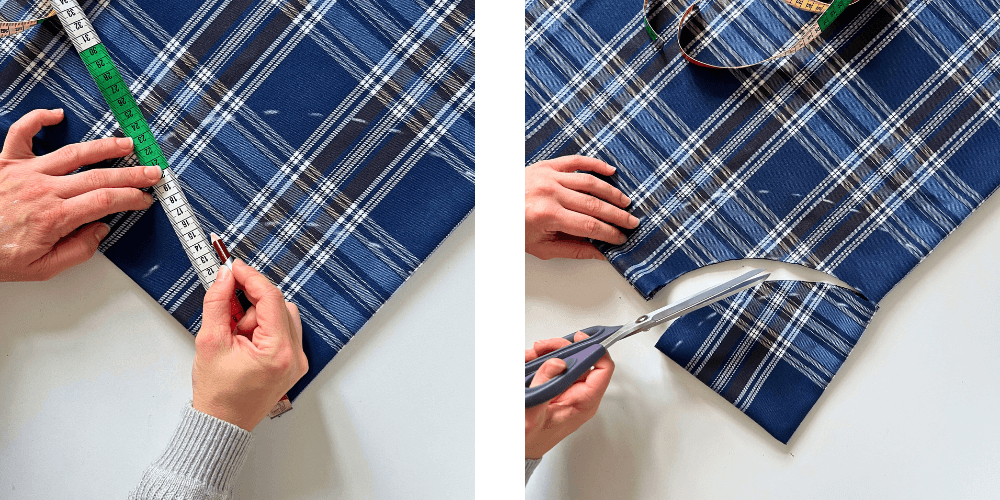 Miss deinen Taillenumfang, deine Hüftweite und die gewünschte Länge des Rocks. Da wir mit nicht dehnbarem Stoff arbeiten, nehmen wir das Maß für die Hüften, damit das Rockteil breit genug ist, um es anzuziehen. Addieree zu deinem Hüftumfang 4 cm (für mehr Komfort) und dividiere das Ergebnis durch 2π (bzw. 6,28), um den Radius zu erhalten. Beispiel: 96 cm (Hüftumfang) + 4 cm = 100 cm. 100 ÷ 2π = Radius 15,9 cm. Übertrage diesen Radius auf die Ecke des gefalteten Stoffes (siehe Bild) und markiere die Taillenlinie in einem Bogen. Schneide entlang dieser Linie.