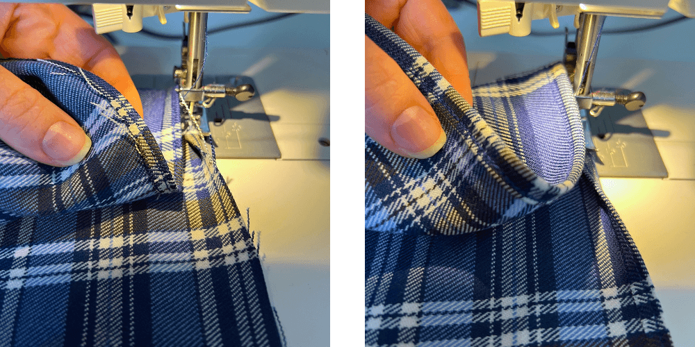 Das Rockunterteil wird gesäumt. Falte die Unterkante zunächst einmal um ca. 0,5 cm um, nähe sie fest, falte sie dann noch einmal um und nähe sie erneut fest.