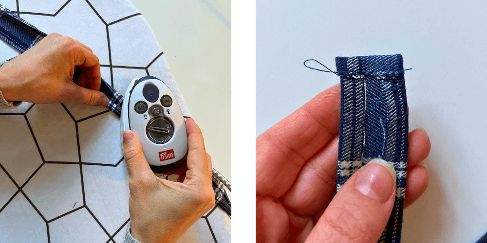 Miss die Diagonale deines Rocks. Schneide einen 4,5 cm breiten und diagonal + 1 cm langen Streifen zu. Falte die Seitenkanten des Streifens 1 cm nach innen, dann falte die Unterkante 1 cm nach innen und nähe sie fest.