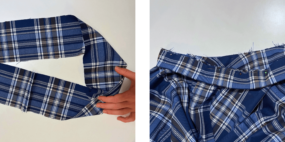 Für den Gürtel schneide einen Streifen in der Länge des Taillenumfangs des Rocks (bei mir sind das 100 cm) + 2 cm für die Naht und einer Breite von 10 cm (für 4 cm Gummiband) zu. Nähe den Gürtel zu einem Kreis zusammen, nähe ihn an den Rock und lass eine 10 cm lange Öffnung, durch die du später das Gummiband ziehst.