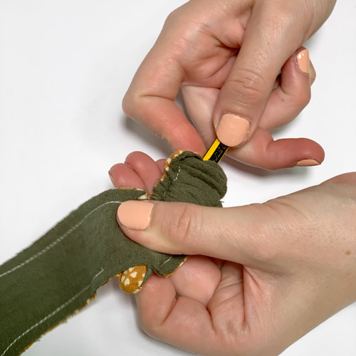 3. In den Ecken wird der Nahtzuschlag verkürzt und das genähte Band mithilfe eines Bleistiftes auf die richtige Seite gedreht.