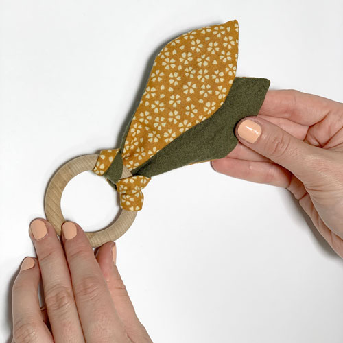 4. Das Loch wird genäht und das Band um den hölzernen Ring herumgebunden. Mit dem Artikel können wir jeden Kleinen erfreuen, dem das Spielzeug noch besonders während des Zahnwachstums gefallen wird.