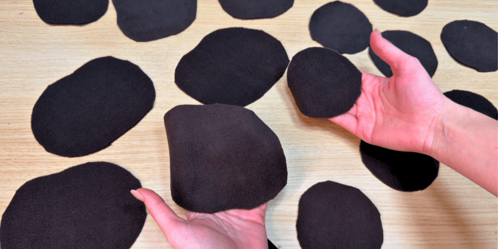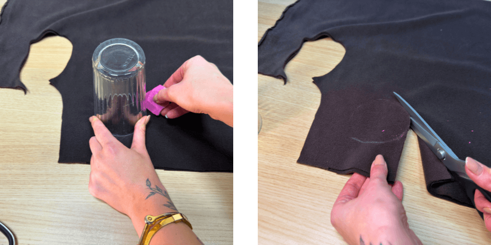 Aus Velours schneiden wir Kreise aus. Dabei können wir uns mit einem Glas helfen und dessen Rand nachzeichnen. Die Kreise können auch freihändig ausgeschnitten werden. Sie müssen nicht perfekt sein.