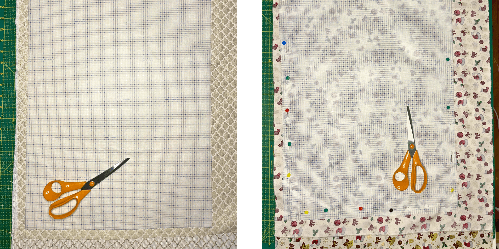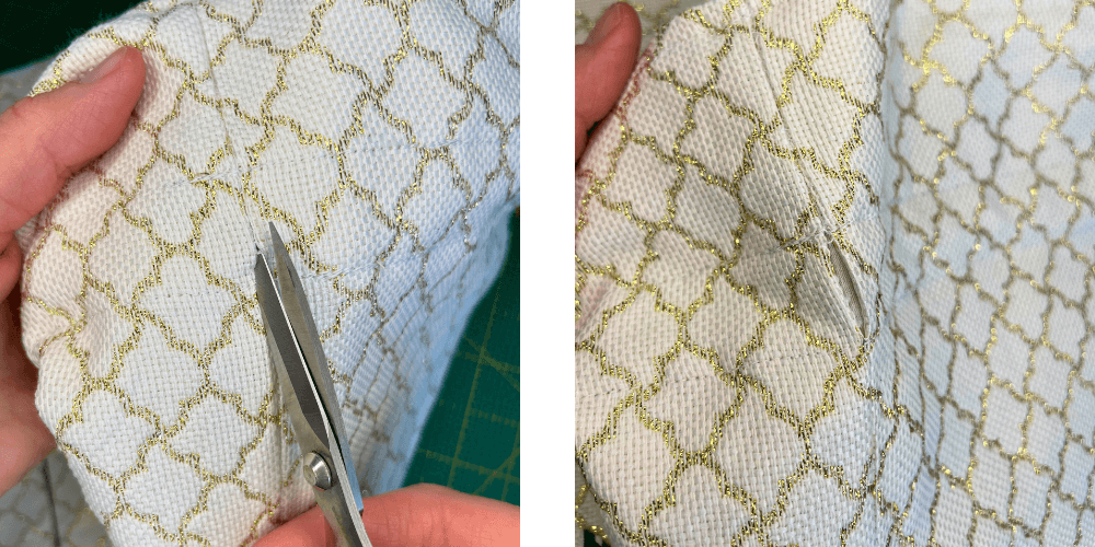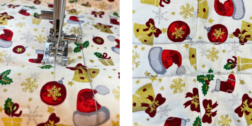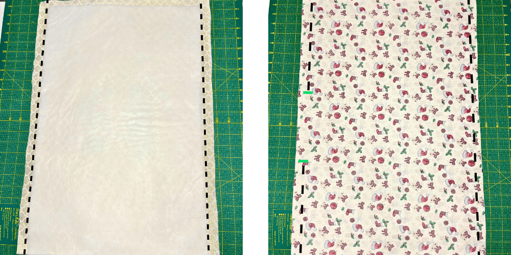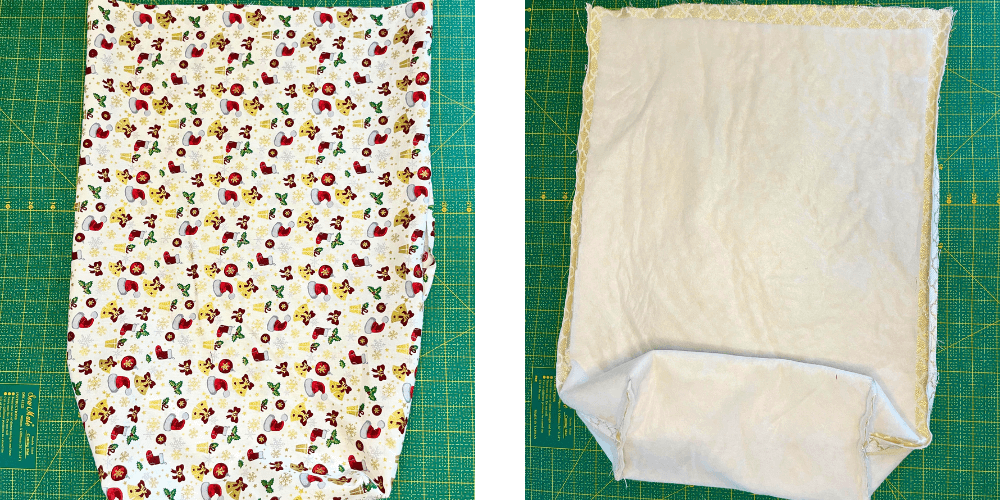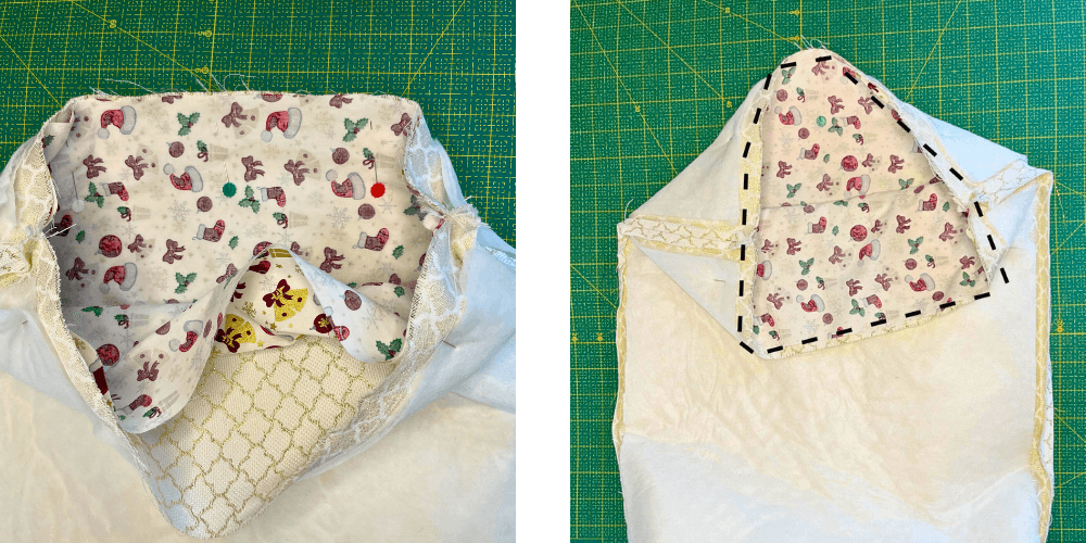 Die Seitennähte schließen, wie auf dem Bild gezeigt. Im Futterstoff eine Öffnung von ca. 10 cm lassen, um den Beutel später wenden zu können.