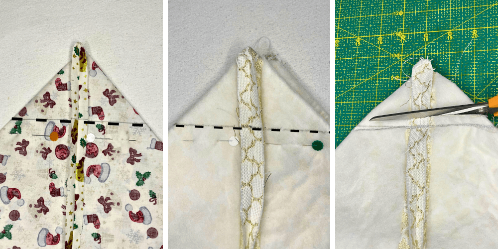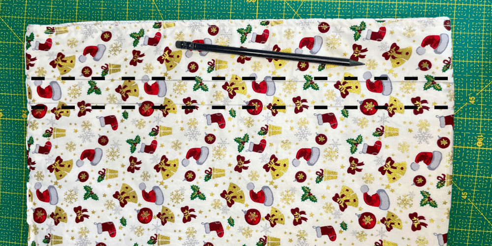 Oben zwei Linien markieren: die erste ca. 5 cm vom Rand, die zweite 2 cm darunter. Auf beiden Seiten markieren, damit die Nähte gleichmäßig sind. Zwei Rundnähte nähen und die Seiten zusätzlich verstärken.