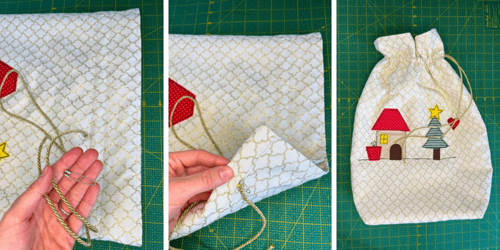 Den Beutel wieder auf rechts wenden. Auf einer Seite zwischen den beiden parallelen Nähten die Naht auftrennen, damit eine Öffnung entsteht, durch die die Kordel geführt wird.