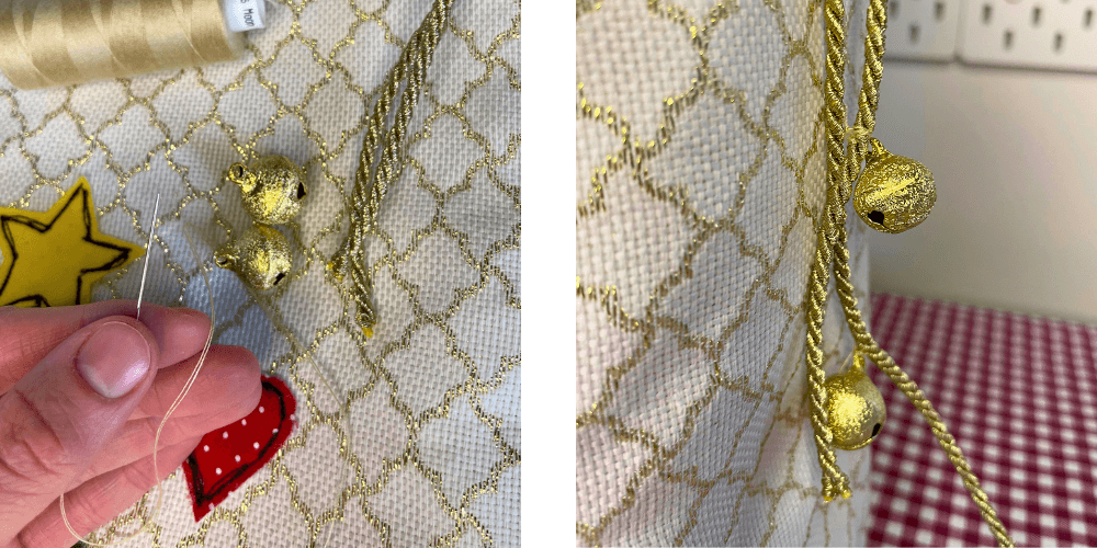 Zum Schluss die Kordel mit zwei goldenen Glöckchen verzieren. Die Glöckchen an beide Enden der Kordel annähen.
