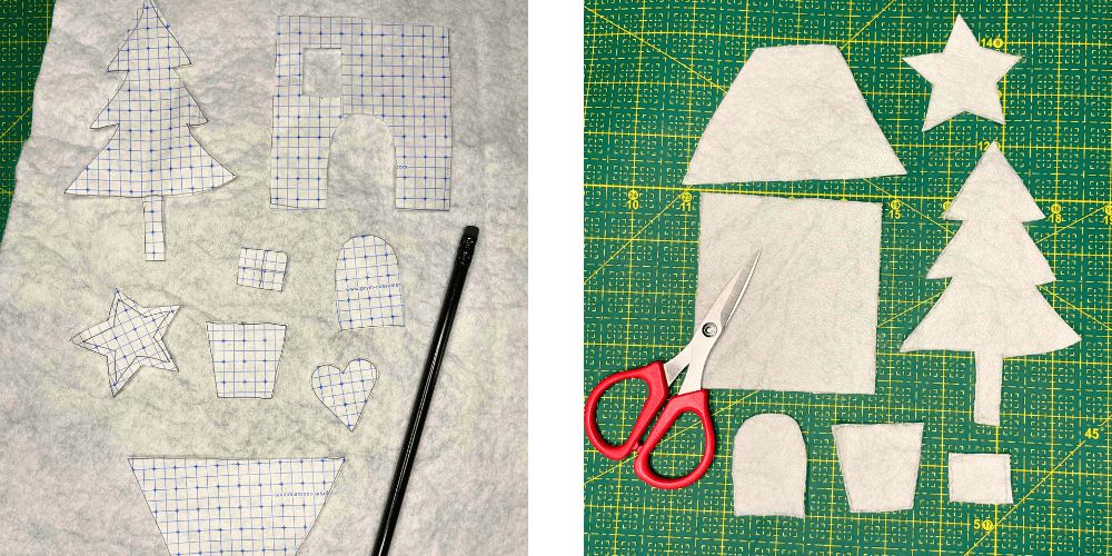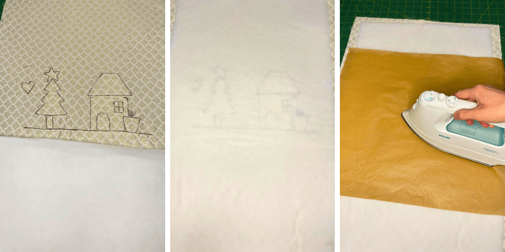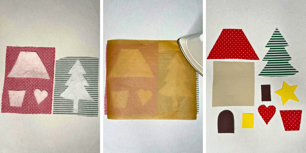 Die ausgeschnittenen Motivteile mit der Klebeseite auf die Rückseite des Stoffes legen. Backpapier darüberlegen und aufbügeln. Das Motiv erneut ausschneiden.