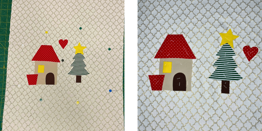 Auf der rechten Seite des Außenstoffes die Mitte des vorderen Beutelteils suchen und alle Applikationsteile darauf platzieren. Mit einigen breiten Handstichen provisorisch fixieren, damit sich die Teile beim Nähen nicht verschieben.