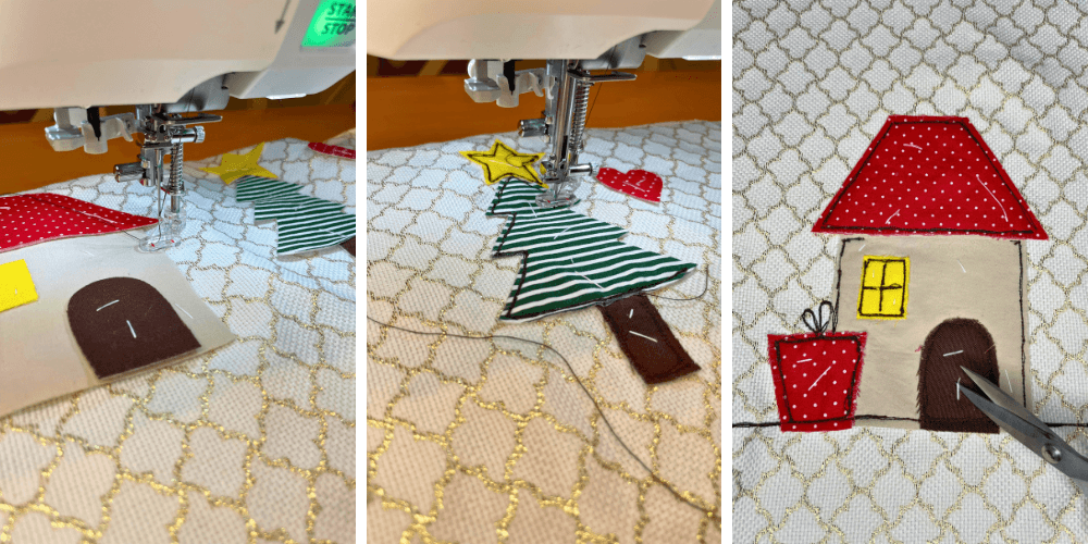 Alle Teile der Applikation mit der Nähmaschine umranden. Wenn die Nähmaschine Freihandnähen ermöglicht, kann der passende Aufsatz verwendet werden. Garnfarbe an das Motiv anpassen oder für mehr Kontrast dunkleres Garn verwenden.