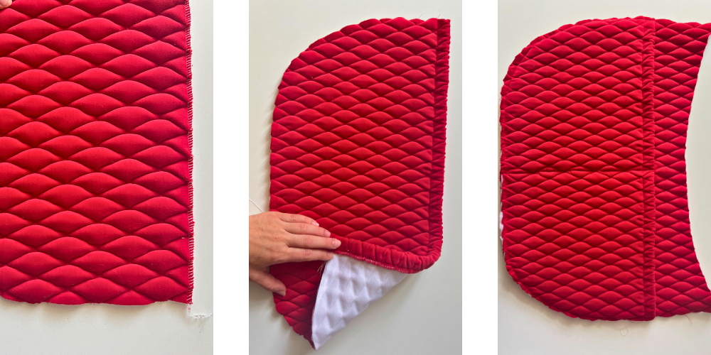 Schneide alle erforderlichen Schnittteile aus dem Steppstoff und dem Futterstoff aus. Vergiss nicht nicht die Nahtzugabe, die überall 1 cm beträgt, außer am oberen Rand der Tasche, wo sie 2 cm beträgt! Klebe den Schnittteil für die Außentasche mit Zentilin fest. Die Oberkante mit einem Zickzack- oder Overlockstich versäubern, 2 cm umschlagen und nähen. An eine Seite der Tasche nähen und in der Mitte zusammennähen, sodass zwei Taschen entstehen.