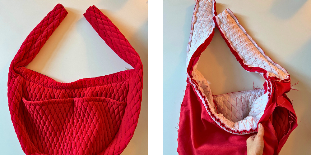 Durch das Loch im Futter drehen wir die Tasche auf die rechte Seite.