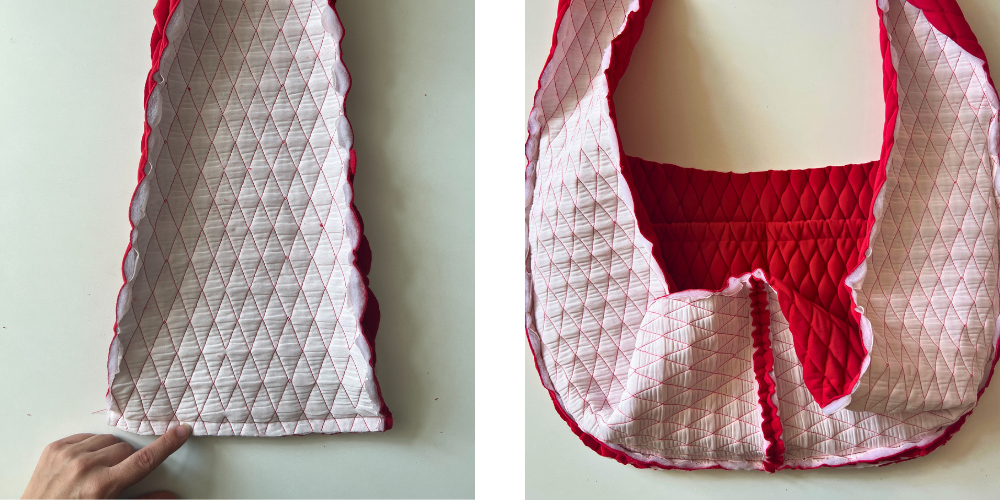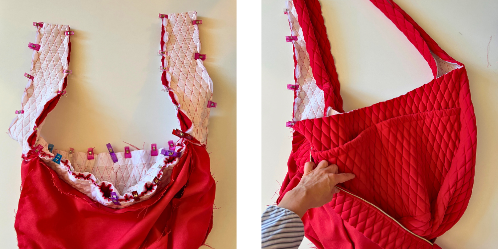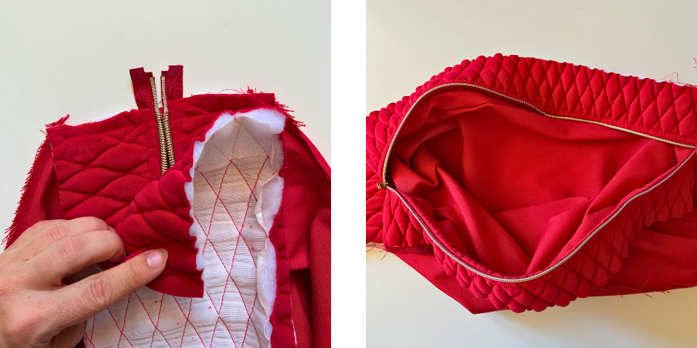 Wir drehen den äußeren Teil der Tasche auf die rechte Seite, öffnen den Reißverschluss und ziehen den äußeren Teil der Tasche über das Futter. Wir achten darauf, dass sich die linke Seite des Futters auf der Außenseite befindet. Wir nähen von der Oberseite des Schulterriemens entlang der gesamten Oberkante der Tasche von beiden Seiten. Den oberen Teil der Schulterriemen lassen wir ungenäht.