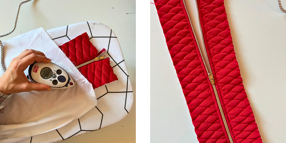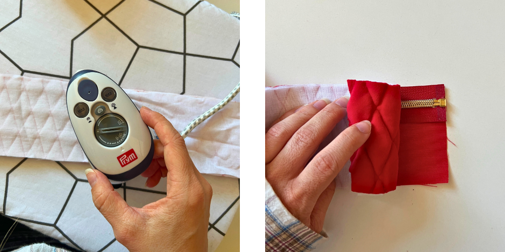Wir stecken den Stoff über den Reißverschluss und nähen ca. 5 mm vom Reißverschluss entfernt.