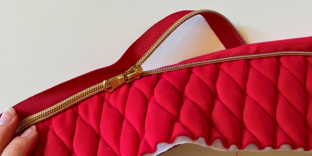 An denselben Teil nähen wir noch die inneren Streifen des Griffs. Den breiteren Teil des Streifens legen wir mit den Enden des Reißverschlusses auf die Vorderseite und nähen entlang derselben Linie wie zuvor mit dem Unterstoff. Wir nähen noch die Streifen am Reißverschluss vom Untergrund separat an, zusammen mit dem oberen Rand des Untergrunds der Tasche, während wir die Bänder am Reißverschluss vom Außenstoff im nächsten Schritt mit dem äußeren Teil der Tasche annähen.