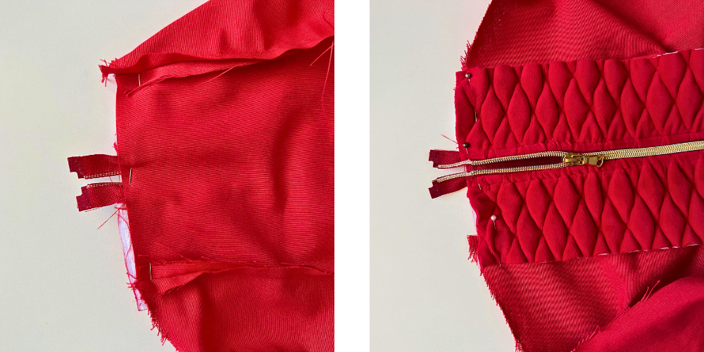 Den Teil mit dem Reißverschluss nähen wir nun auf den Unterstoff. Wir richten den Reißverschlussstreifen am Streifen auf dem Unterstoff aus und nähen ihn auf beiden Seiten fest.