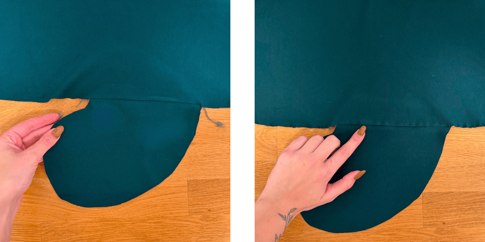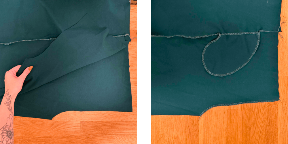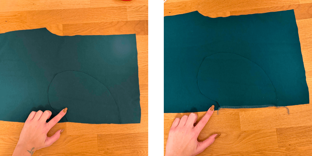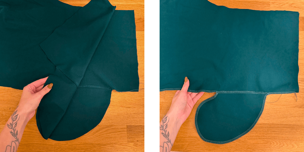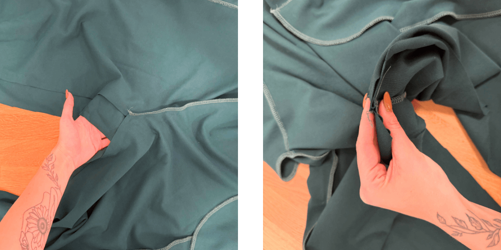 Wenn beide Taschen angenäht sind, legen wir den vorderen und hinteren Teil des Hosenbeins mit den rechten Seiten aufeinander und nähen um die Tasche herum und über die gesamte Länge des Hosenbeins. Das Gleiche wiederholen wir auch auf der anderen Hälfte der Hose, sodass wir zwei vollständige Hosenbeine erhalten.
