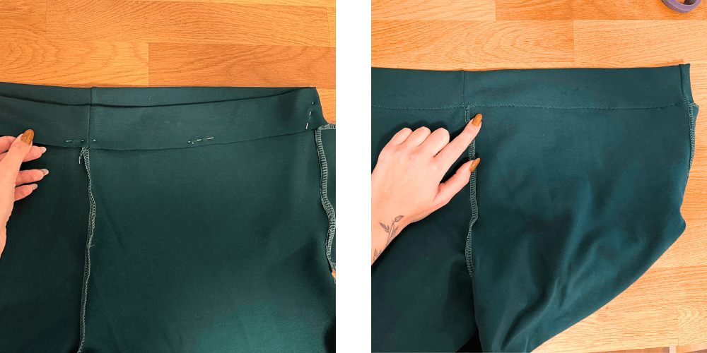 Wir trennen die Naht und nähen mit einem Geradstich darüber. Wir wiederholen den Vorgang auch am hinteren Teil der Hose.