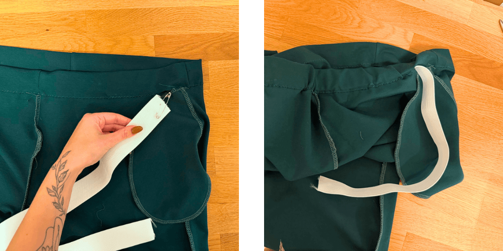 Die Länge des Gummibands wird an der Taille gemessen, 1 cm für die Naht hinzugefügt und abgeschnitten. An einem Ende des Gummibands wird eine Sicherheitsclips befestigt und das Gummiband durch den Tunnel gezogen. Wenn beide Enden aufeinandertreffen, wird das Gummiband mit einer Zickzacknaht verbunden.