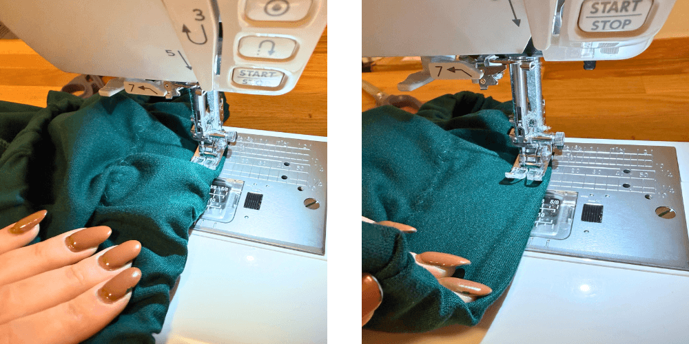 Damit sich das Gummiband beim Tragen nicht verdreht, nähen wir zwei gerade Nähte über den gesamten Umfang der Taille. Wir positionieren den Nähfuß am Rand der Taille und dehnen das Gummiband während des Nähens leicht, damit wir auf glattem Stoff nähen. So erhalten wir ein schönes, gleichmäßiges gerafftes Aussehen.