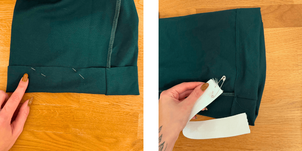 Wir können uns aber auch für ein Gummiband entscheiden: Wir messen den Umfang des Beins, addieren 1 cm für die Naht, legen das Gummiband in den Tunnel und nähen es fest. Genauso wie bei der Taille.