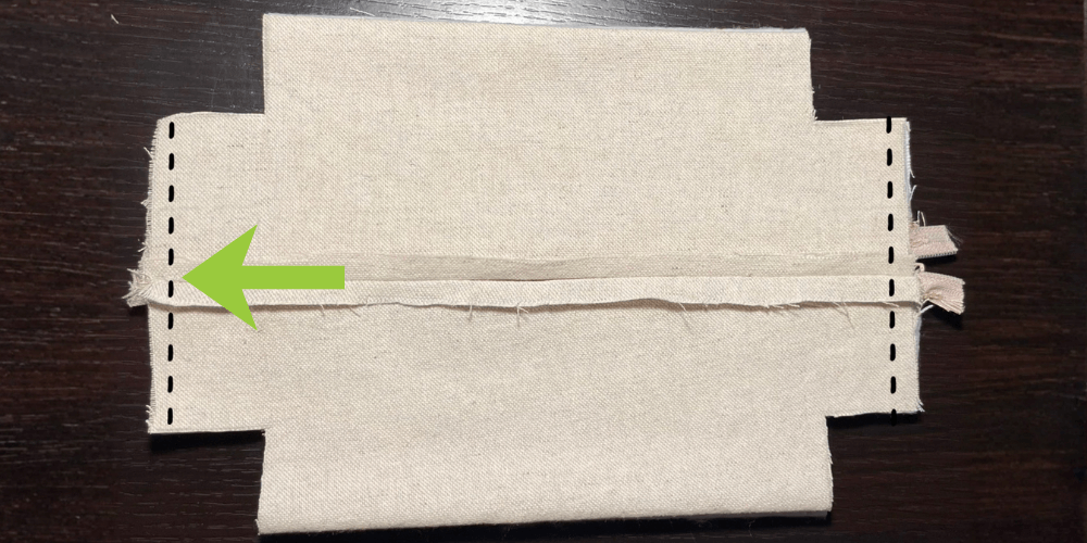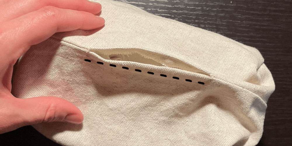 Wir falten den Außenstoff und den Futterstoff zusammen und nähen sie, wie auf dem Bild gezeigt. Wir lassen etwas Platz, damit wir die Tasche wenden können.